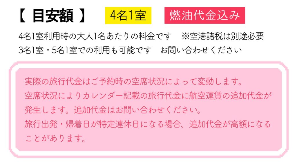- 出発日・カレンダーに記載の旅行代金は目安であり、空席状況により、航空運賃の追加料金が発生いたします。