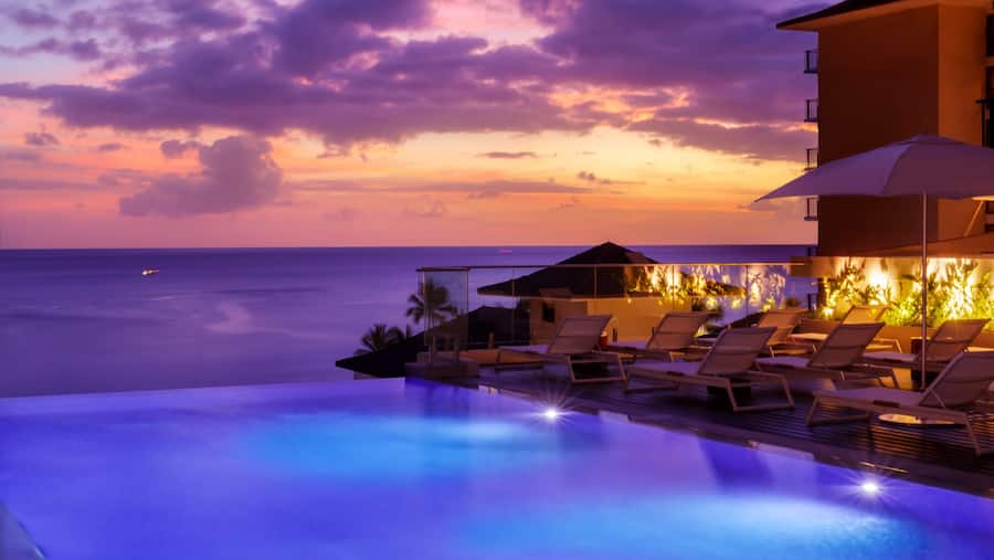 8階屋外には、青い空と青い海が一体となりハワイの自然を存分に感じることができるインフィニティープールがあります。ラップスイムとリラクゼーションを同時に楽しめるよう設計された⻑⽅形のインフニティプールからは、ワイキキビーチが⼀望できます。プールを囲むサンデッキには、ハワイの⽇差しを体中に浴びながら冷たいカクテルをお楽しみいただけるプールバー、ホットジャグジーなど快適にお寛ぎいただけます。また、姉妹ホテル「スパハレクラニ」のセラピストによるプールサイドでのトリートメントをお楽しみいただけます(事前予約制)
