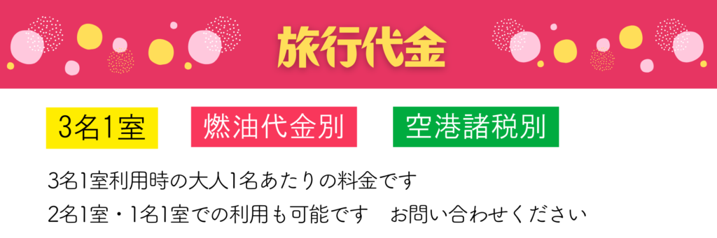 - 旅行代金以外に、空港使用料・現地税・国際観光旅客税がかかります。
