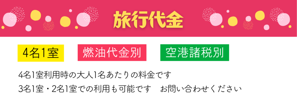 - 旅行代金以外に、空港使用料・現地税・国際観光旅客税がかかります。